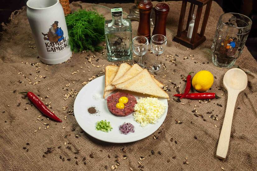 Телятина, яйце перепелине, грінка багету, соус з каперсами та в'яленими томатами.