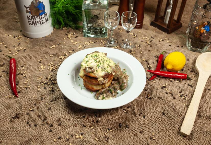 Деруни з куркою та грибами під сиром