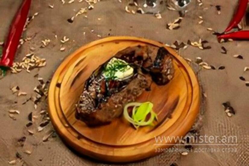 Справжній Американський Стейк (соковитий стейк Нью-Йорк з відбірної яловични замаринований в духмяних травах та засмажений на відкритому вогні).