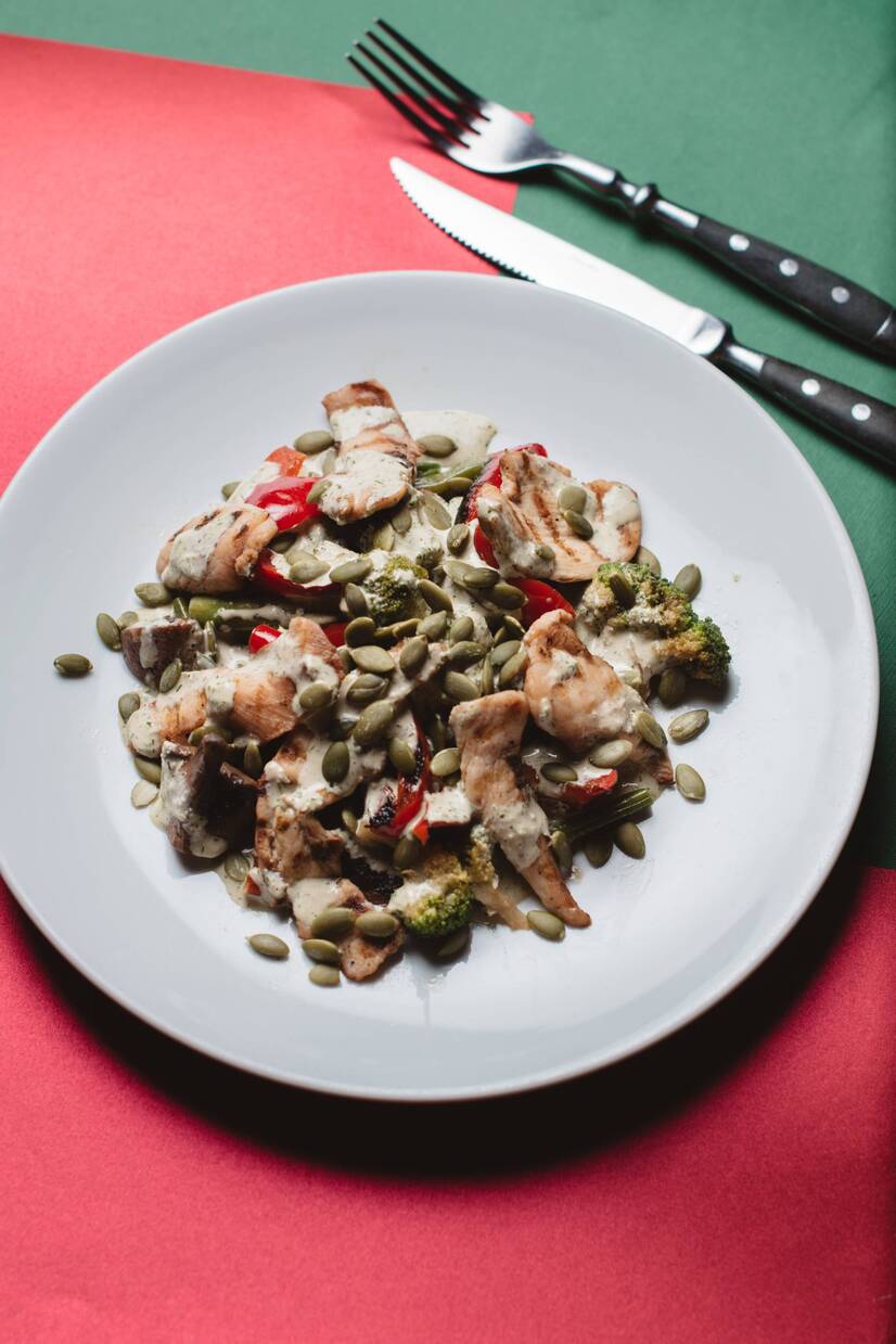 Смажене куряче філе, гриби та перець гриль, броколі, шпарагівка, заправлений зеленим соусом, посипається насінням гарбуза.