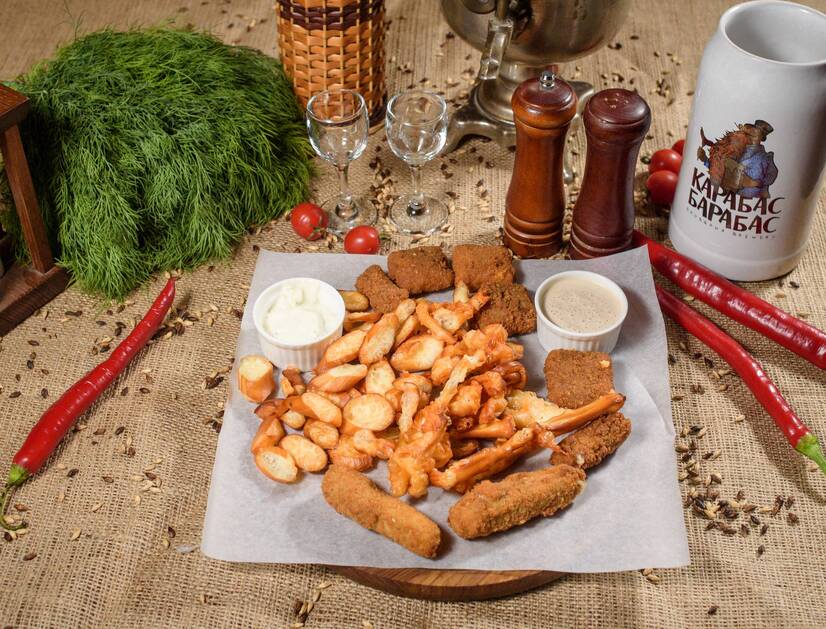 Смачненькі сирні кубики та палички обсмажені в паніровці,сулугіні фрі , чечель фрі, соус тар-тар та цезар. Те, що треба для хорошої компанії.