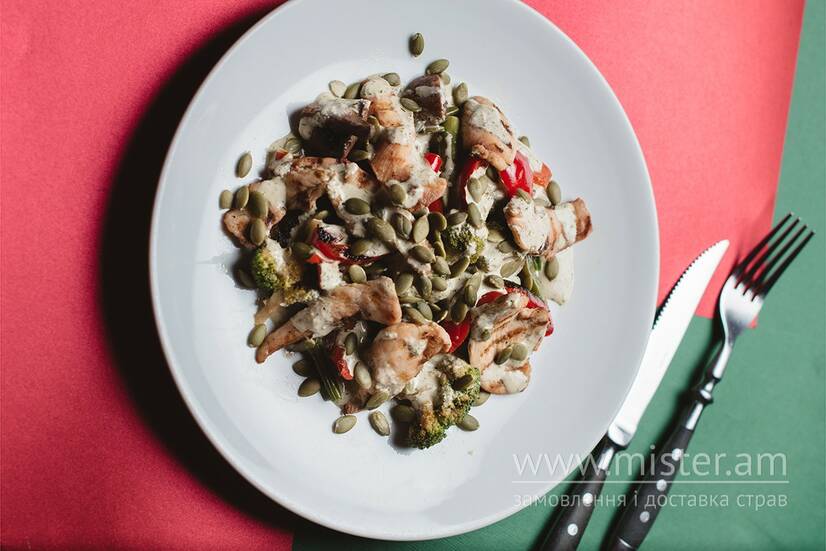 Смажене куряче філе, гриби та перець гриль, броколі, шпарагівка, заправлений зеленим соусом, посипається насінням гарбуза.