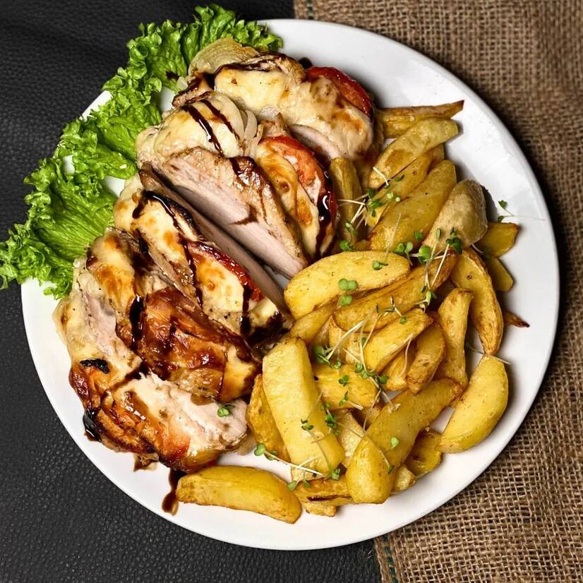 печена свинна корейка , попередньо замаринована у фірмовому соусі з помідором, моцарелою та ріпчастою цибулькою, подається з картоплею по-селянськи
