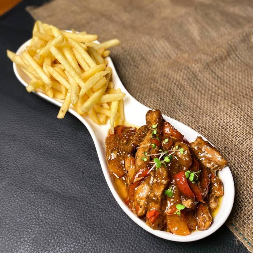тушкована пікантна свинна корейка з овочами, подається із картоплею фрі