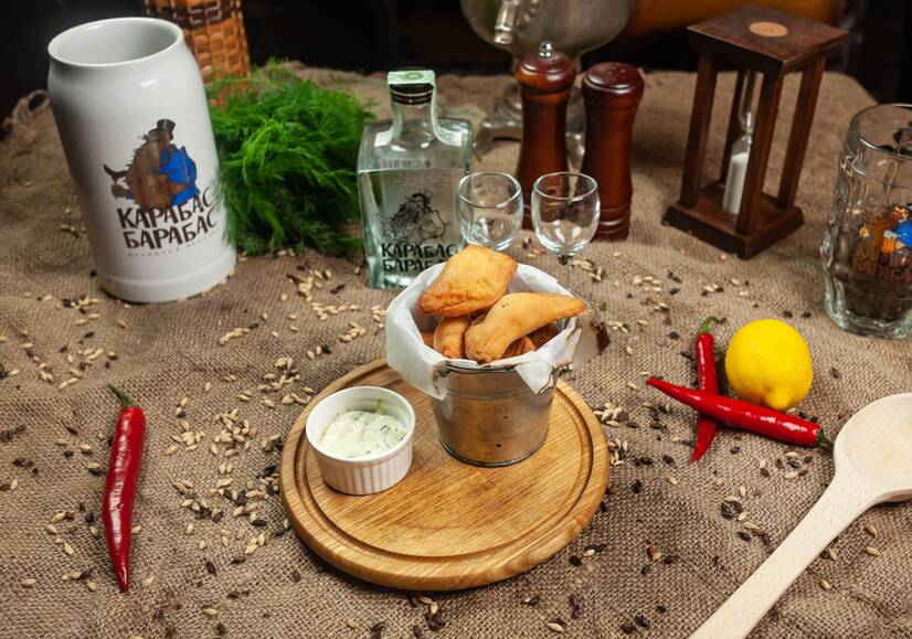 Відро чебуречків до пива (Пікантні золотисті міні-чебуречки із начинкою з копченого сиру та червоного перцю. Подаються з соусом «тартар»)