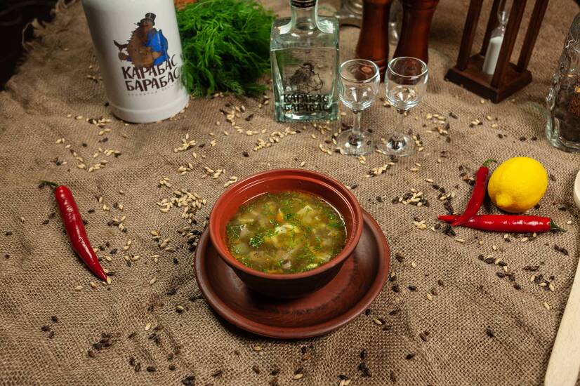 Борщик зелений (Оригінальний борщ зі щавелю з свинною шинкою, картоплею, яйцем, морквою та цибулькою, подається зі сметанкою)