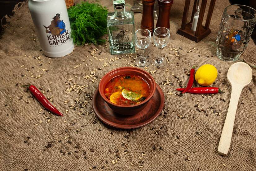 Соляночка (Традиційний м'ясний суп з копченостями, язиком, а також оливками та лимоном)