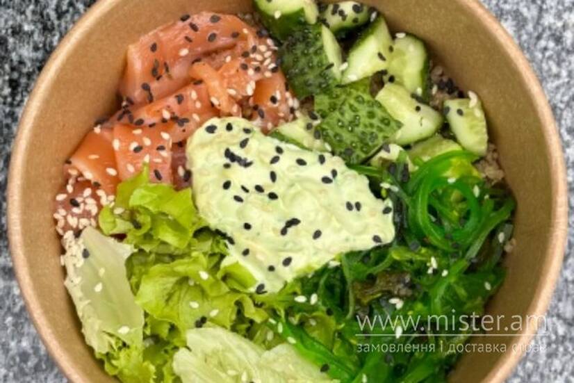 Справжній морський мікс. У складі лосось,чука, огірки, листя салату, вершково-сирний соус, кунжут.