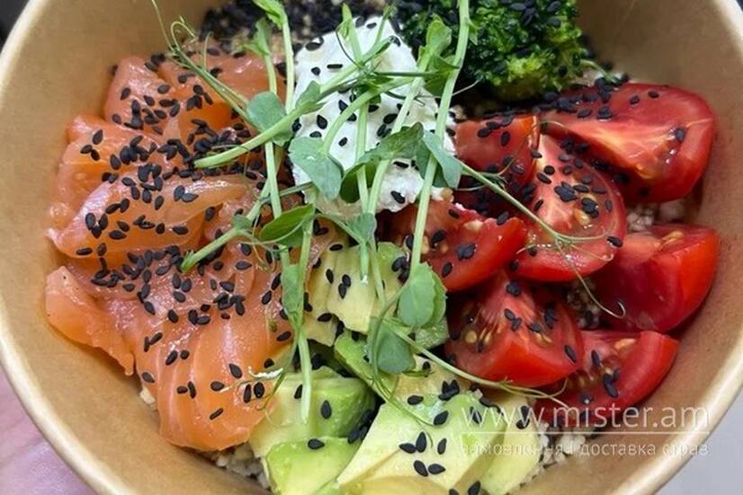 кус-кус, чері, авокадо, броколі, крем-сир, соус теріякі, лосось, чорний кунжут, мікрогрін