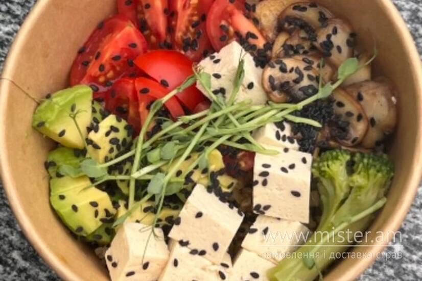 Булгур+овес, соус кисло-солодкий, чері, броколі, шампіньйони,тофу, чорний кунжут, мікрогрін.