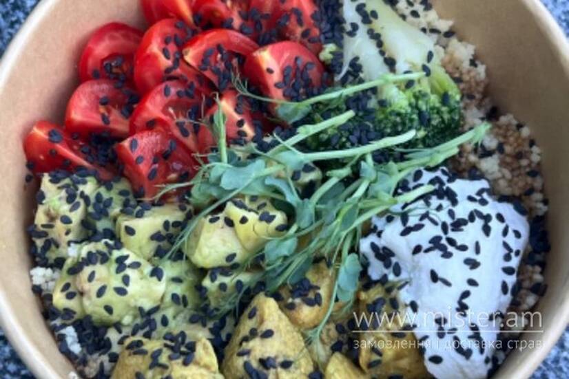Кус-кус, чері, авокадо, броколі, крем-сир, соус теріякі, курка карі, чорний кунжут, мікрогрін.