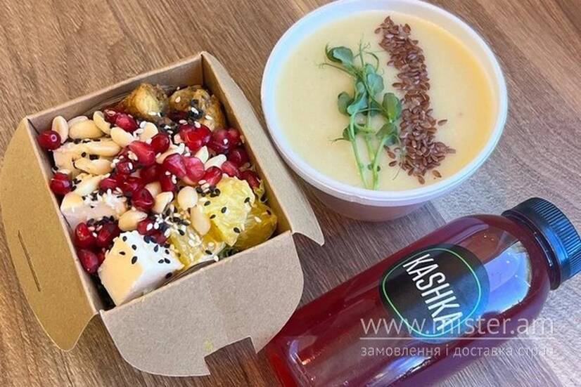 Крем-суп власного приготування + салат з куркою карі + лимонад.