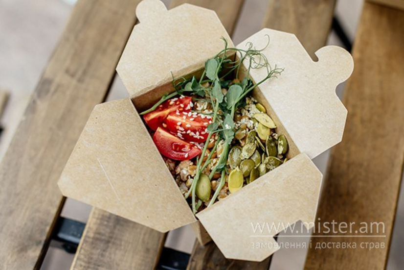 Мікс свіжих овочів тушкуються у соєвому соусі, поєдуючись із міксом цільнозернових круп. Все це ми викладаємо у коробочку та щедро посипаємо гарбузовим насінням, кунжутом і додаємо соковите чері