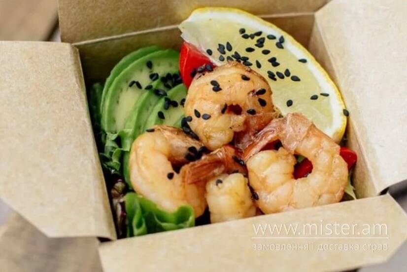 Листя салату, чері, авокадо, креветки, лимон, соус, чорний кунжут.