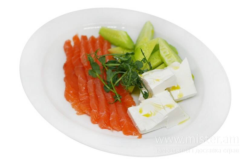 Сьомга слабосолена, сир фета, огірок свіжий, олія оливкова.