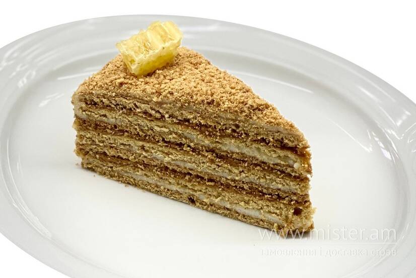 Медові коржі, крем сметанковий (сметана, цукор, лимон), крем згущене молоко (згущене молоко, вершки), медові соти.