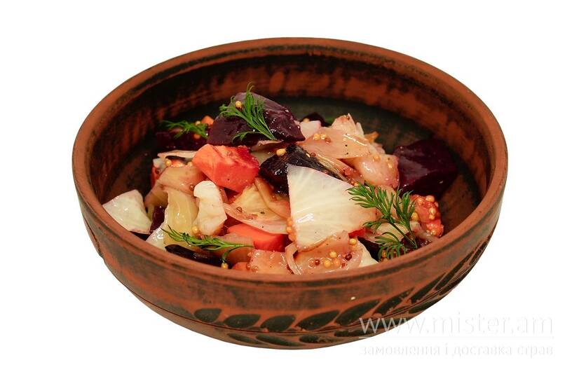 Буряк печений, капуста білокачанна, морква гриль, цибуля ріпчаста, олія соняшникова, часник, гірчиця, сіль, перець чорний мелений, олія ріпакова.