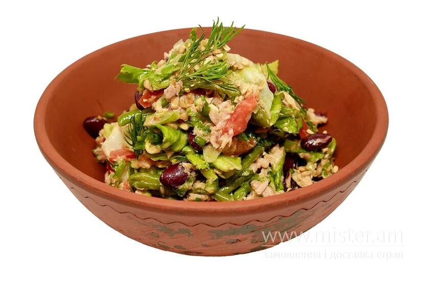 Листя салату, тунець консервований, квасоля, шпарагівка, помідори, цибуля зелена, насіння соняшникове, соус гірчичний.