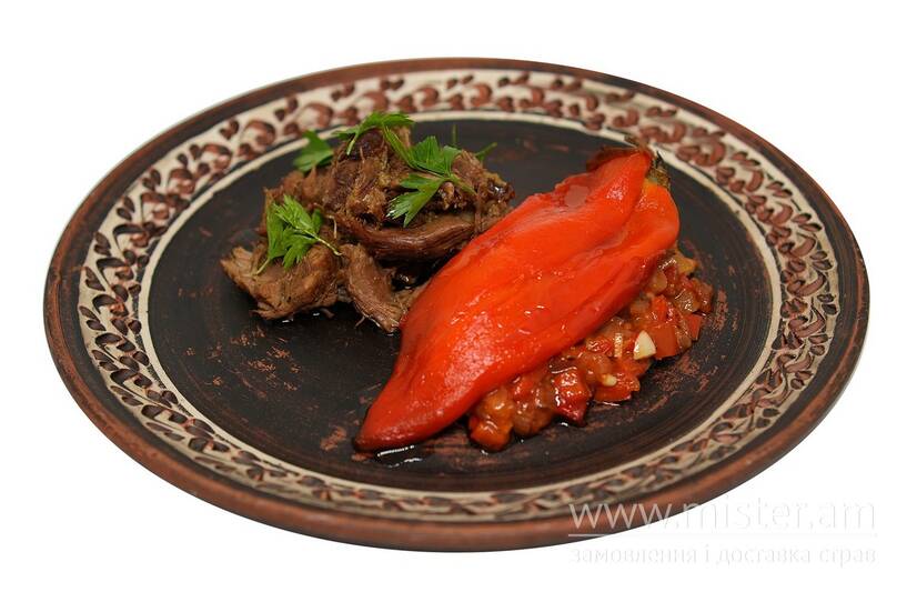 Баранина тушкована, маджа (баклажан, перець болгарський, цибуля ріпчаста, помідор, часник, паприка мелена, томатний соус, цукор), перець болгарський гриль, зелень.