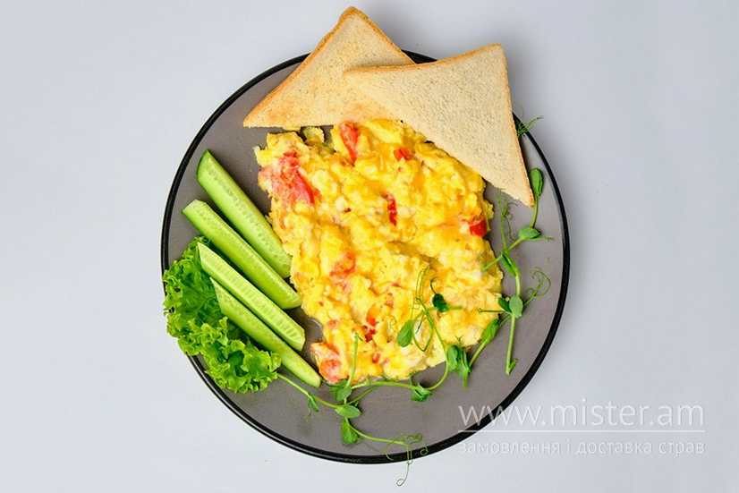 Яєчня-бовтанка смажена на оливковій олії, з твердим сиром, помідорами та тостами.