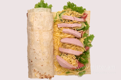 Рол в лаваші з лислям салату, шинкою, помідором та огірком, з твердим сиром та соусом домашнім (майонез та гірчиця).