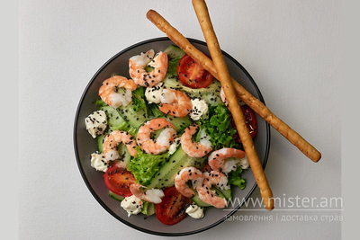 Салат який готується з міксу салатів, варених креветок, помідором, сиром філадельфія та оливковою олією.
