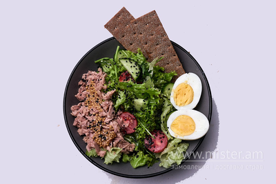 Тунець консервований, листя салату, помідори чері, огірок, яйце куряче, рукула, та соус цезар.