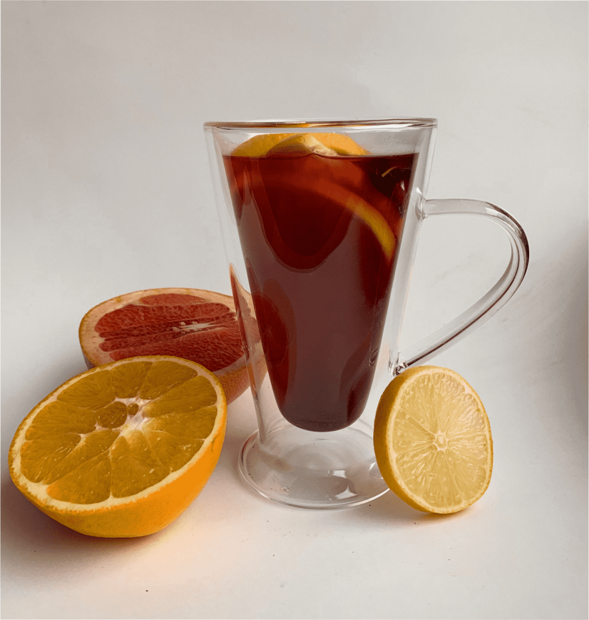 Чай на основі цитрусів (лимону, апельсину, грейпфруту) з додаванням гранатового сиропу та імбірю за бажанням.