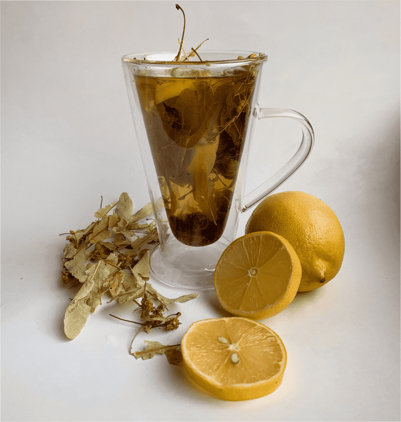 Липовий чай на основі варення з соснових шишок з додованням лимону та розмарину.
