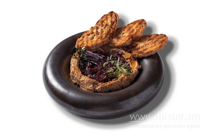 Ніжний паштет з курячої печінки з карамелізованою в темному пиві цибулею, доповнений хрусткими грінками з чіабати власного виробництва.