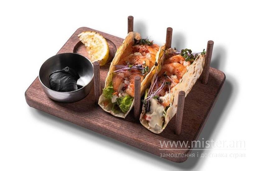 Обсмажені креветки, овочева сальса, листя айсбергу з часниковим соусом. Подаємо у хрусткій тортильї та посипаємо пластівцями чилі.