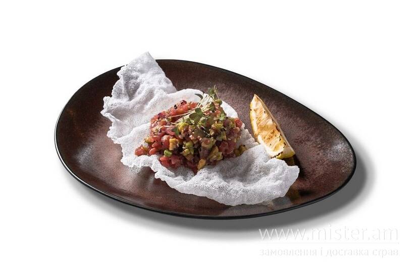 Дрібно нарізаний свіжий тунець, авокадо та синю цибулю заправляємо імбирним соусом. Подаємо на хрусткому чипсі з рисового паперу.