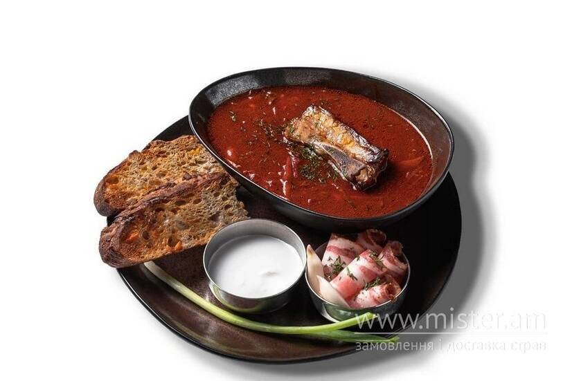 Традиційний червоний борщ з томленим свинячими ребром. Подаємо зі сметаною, салом, зеленою цибулею та хлібом з журавлиною. Ситна страва з домашнім смаком.
