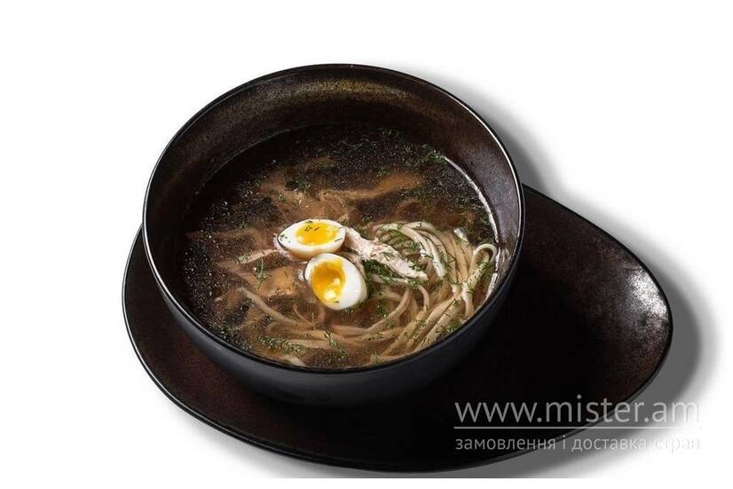 Куряче філе, локшина, перепелине яйце та свіжа зелень. Легка страва з насиченим смаком.