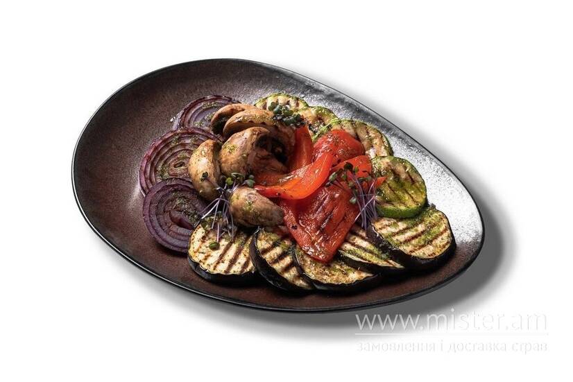 Грильовані баклажан, цукіні, болгарський перець, печериці та синя цибуля доповнені спеціями.