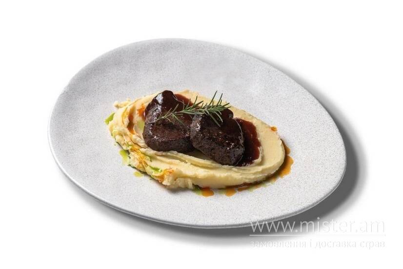 Соковите м`ясо в поєднанні з ніжним картопляно-селеровим пюре та насиченим сливовим соусом.