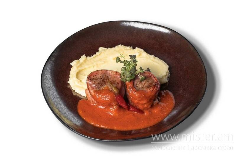Вирізку свинини маринуємо з розмарином і спеціями. Загортаємо в бекон і смажимо на грилі до рум’яної скоринки. Подаємо з картопляним пюре та пікантним соусом пірі-пірі.