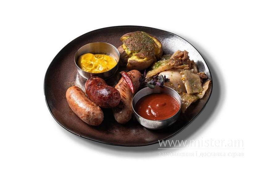 Асорті з трьох видів соковитих домашніх ковбасок: яловича з перцем халапеньйо, зі свинини з сиром моцарела та зеленню, куряча з в’яленими томатами. Подаємо з печеною картоплею з часниковою олією, та печеною капустою.