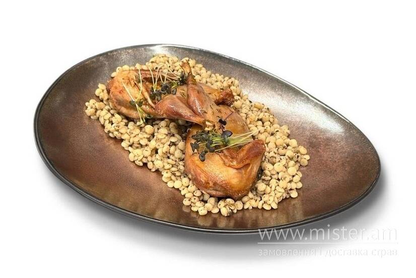 Запікаємо попередньо мариновану перепілку до золотистої скоринки. Подаємо під медово-часниковим соусом з трюфельним пті-птімом.