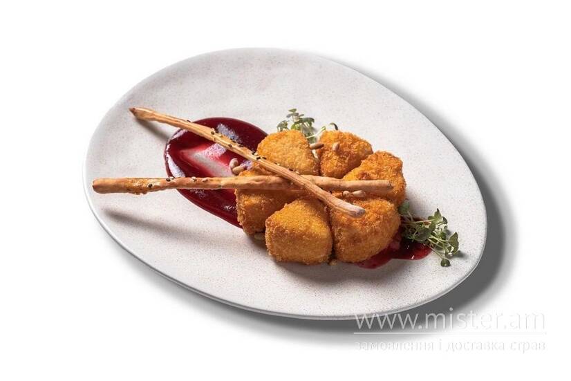 Шматочки камамберу обсмажені в сухарях панко. Подаємо на кюлі з лісових ягід та кедровими горіхами.