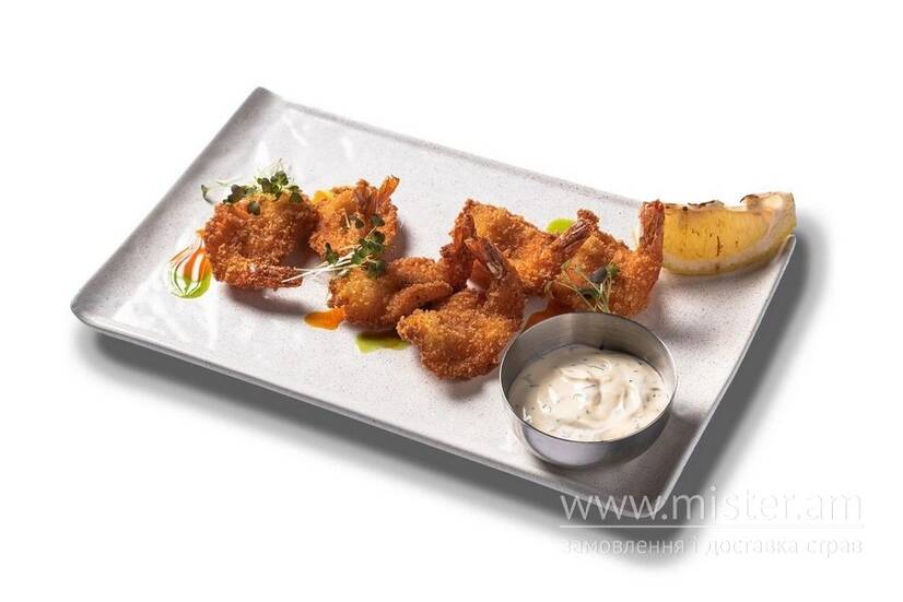 Хрусткі креветки в сухарях панко з часниковим соусом.