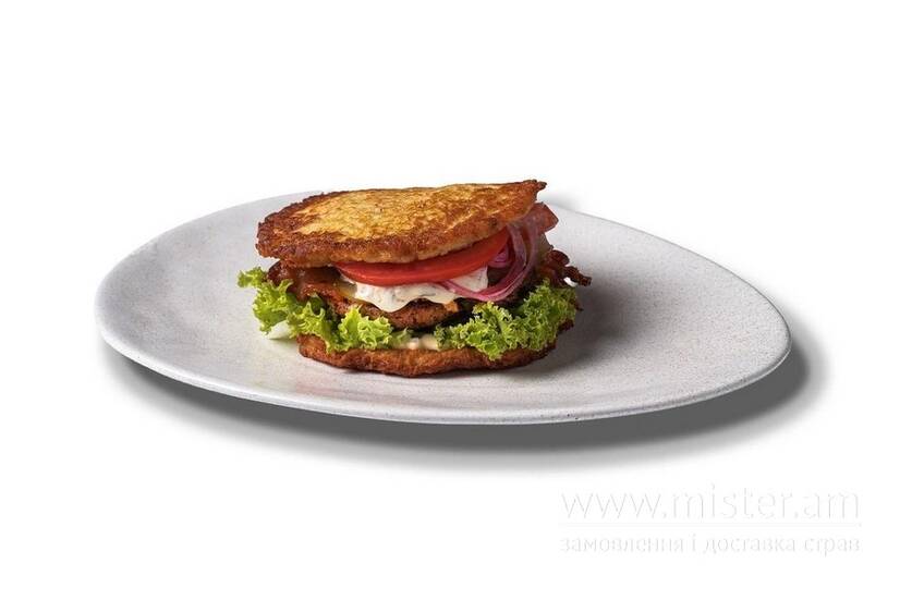 Два деруни, листя салату, слайси томату, соковита яловича котлета просмажки medium, маринована цибуля, слайси соленого огірка, соус тартар.