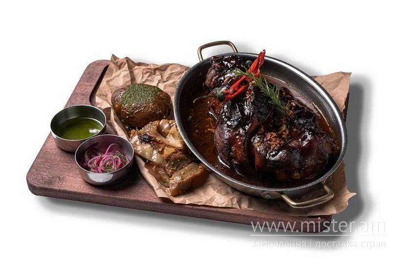 Рулька томлена в темному пиві зі спеціями. Гарнір: запечена картопля під часниковою олією, салат з печеної капусти по-волинськи та соленим огірком.