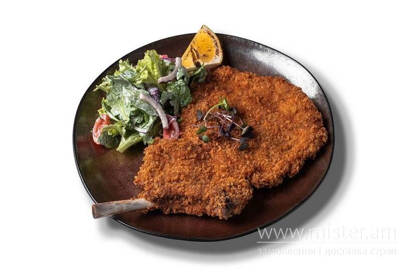 Соковите м`ясо свинини на кістці, паніроване і обсмажене до золотої скоринки. Подаємо зі свіжим салатом.