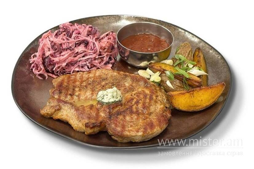 Соковитий стейк з свиного ошийка подаємо з печеною картоплею, салатом Коул слоу та соусом BBQ.