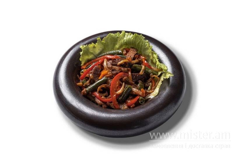 Яловичий язик смажимо методом стір-фрай з болгарським перцем, стручковою квасолею, цибулею, часником, імбирем, перцем чилі у поєднанні з соусом демігляс. Подаємо на свіжому листі салату.