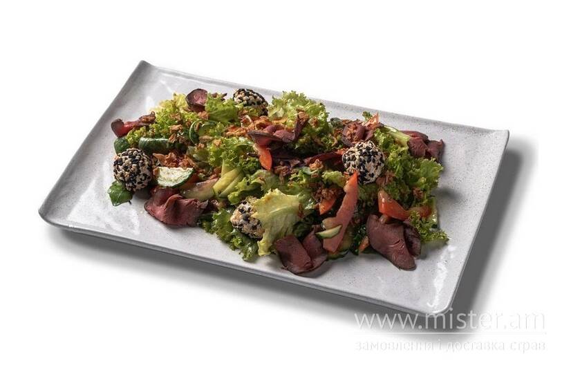Ростбіф, листя салату, болгарський перець, свіжий огірок, кульки з крем-сиру в кунжуті. Заправляємо медово-гірчичним соусом.