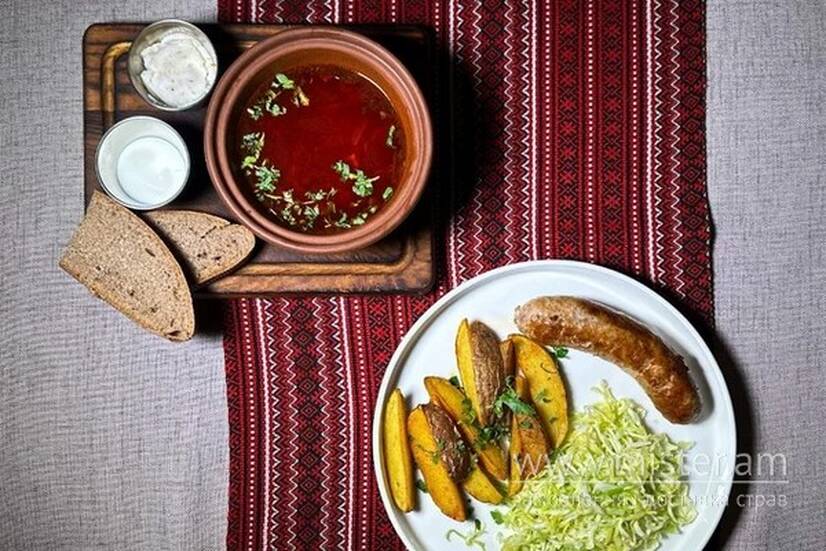 Борщ червоний зі сметаною, картопля по-селянськи з ковбаскою гриль, салат з капусти з олією, хліб.