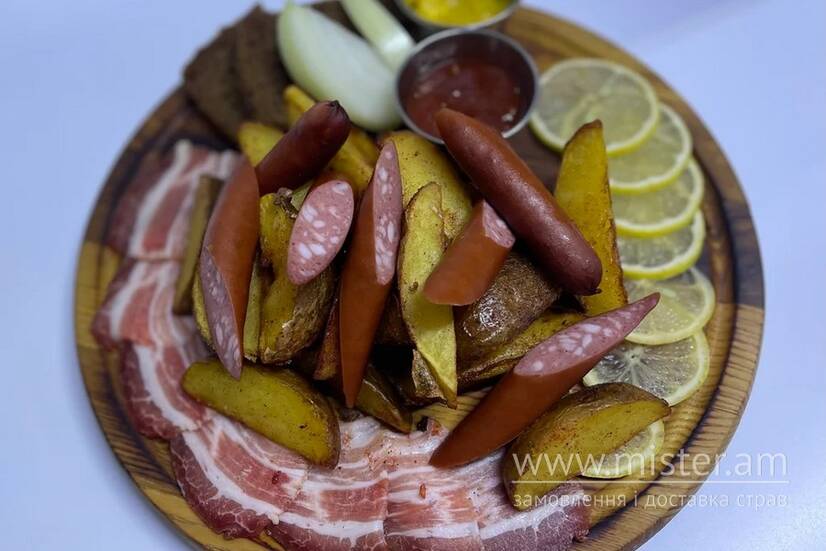 Картопля по-селянськи, ковбаски мисливські, бочок солений, лимон, цибуля, хліб, гірчиця соус Сацебелі.