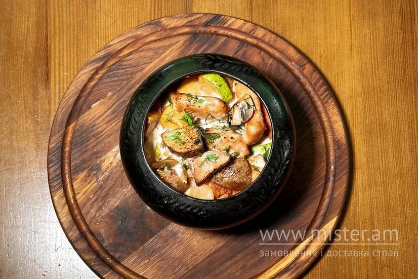 Ніжне поєднанння свинини, міксу овочів у вершковому соусі, часником, печериць та зелені.